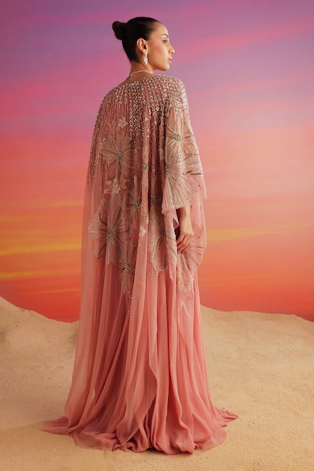 Salmon pink kaftan style gown crafted from tulle, crepe, and georgette