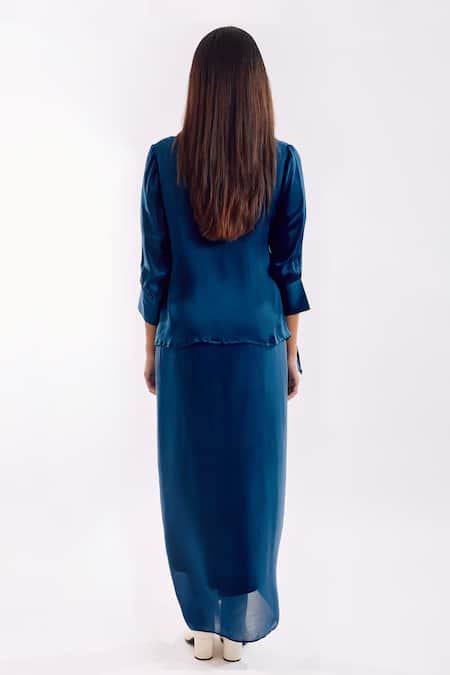 Blue Side Tie Coord set featuring a top with tie-up details and a draped skirt. Made from georgette satin, it gently hugs the body for a flattering fit.
