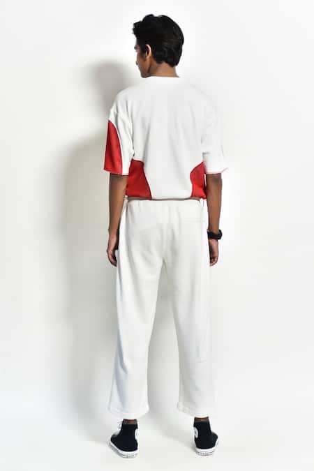 Off white pant with ribbed elasticated waistband, side toggle fastening & side pockets.