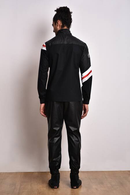 Black high-neck jacket with contrast stripes, toggle fastening high-neck & elasticated cuffs.