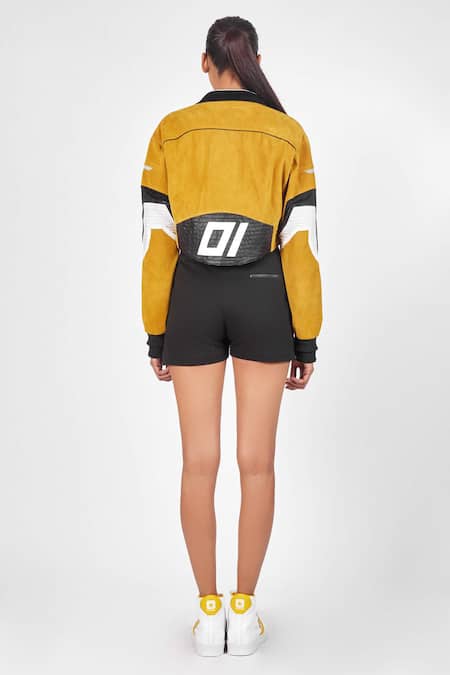 Mustard cropped jacket with notched lapel, mesh contrast panels, front-zipper & ribbed cuffs.