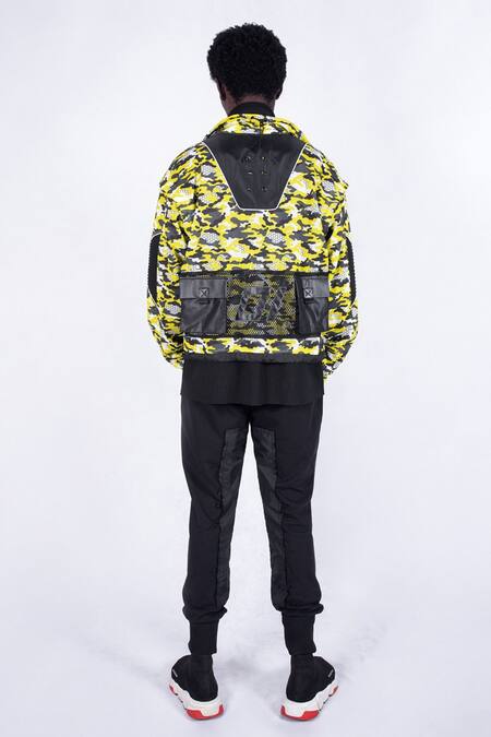 Multicolored polyester mesh based jacket with front-zipper, back utility pockets & pintuck panel sleeves.
