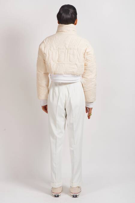 Off white parachute based cropped puffer jacket with quilted logo motifs, front zipper & puff sleeves.