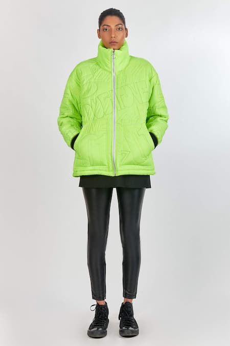 Neon green parachute based puffer jacket with quilted logo motifs, front zipper & puff sleeves.