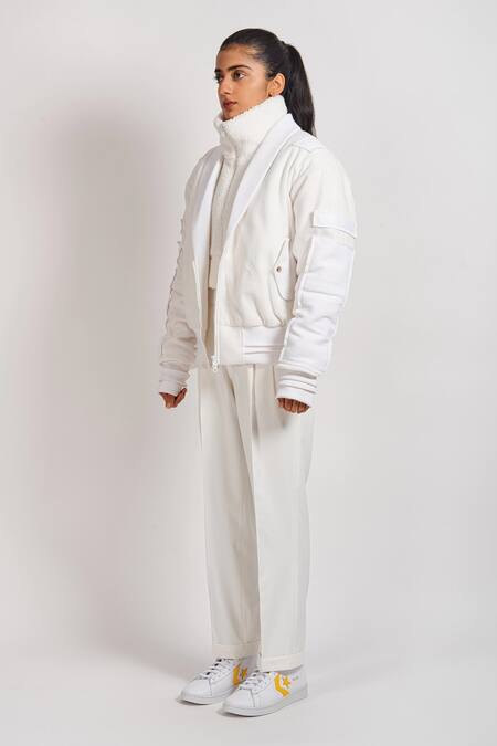 Off white bomber jacket with shawl lapel, patchwork detail, ribbed cuffs & front-zipper.