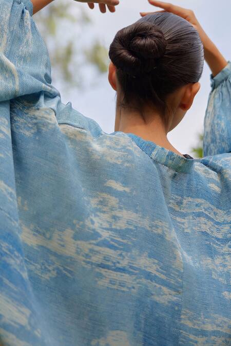 Blue shirt with all over deni print, band collar & kimono balloon sleeves.