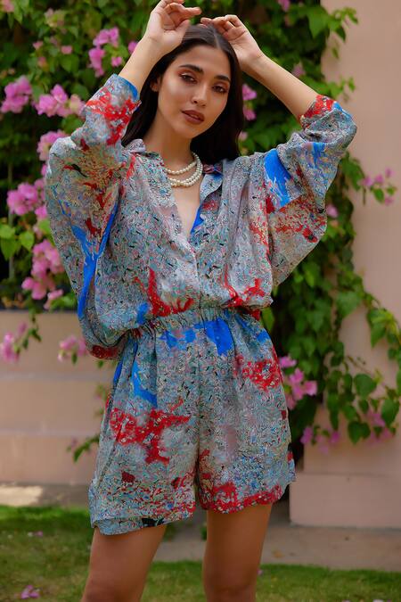 Multi Color Cdc Printed Kera Band Collar Kimono Sleeve Playsuit