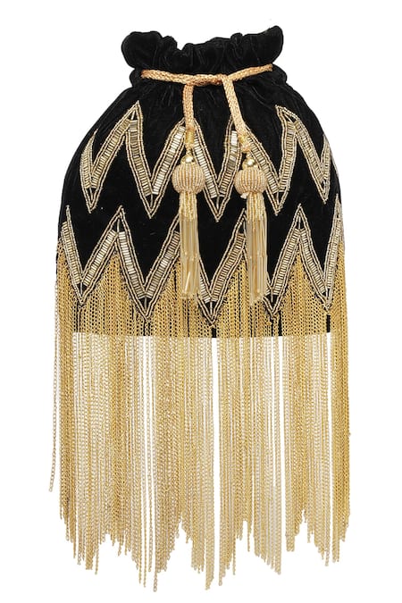 Black potli made from velvet featuring gold embroidery and metal tassels