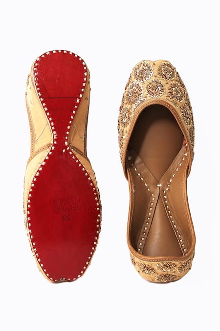 Gold-toned floral embellishments covering the upper surface., Intricate stitching details along the edges.