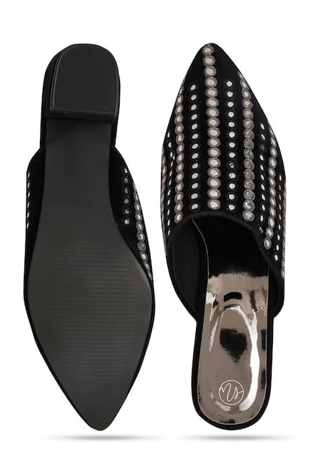 Decorative embellishments arranged in vertical lines, Pointed toe design, Comfortable block heel for stability