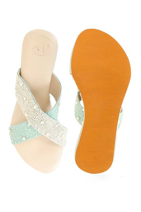 Green wedges featuring a criss cross strap design and all over pearl embellishments
