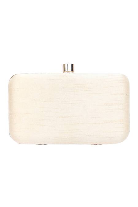 Beige raw silk clutch featuring eagle embroidered motifs and a twist closure