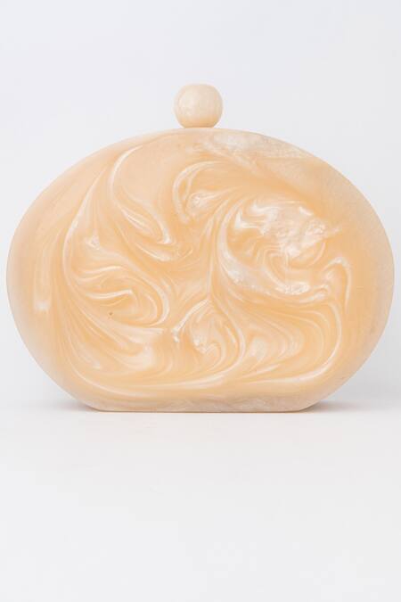 Beige resin clutch featuring hand embroidery with checkered motifs and mother of pearl embellishments