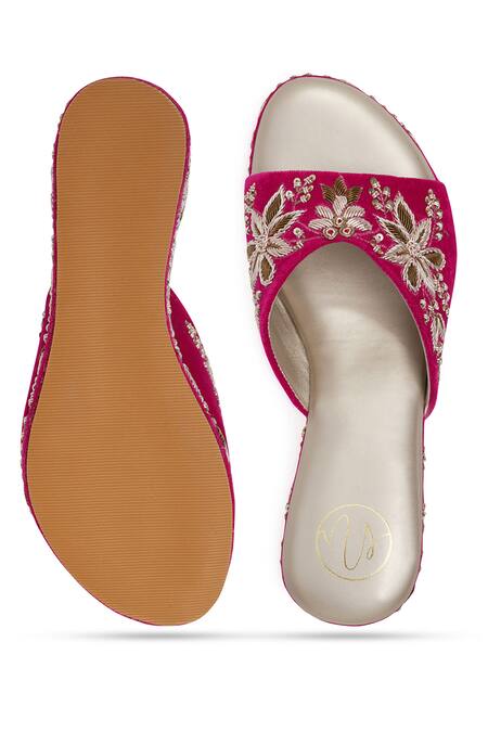 Magenta velvet wedge sandals featuring golden embroidery with floral and leaf motifs.