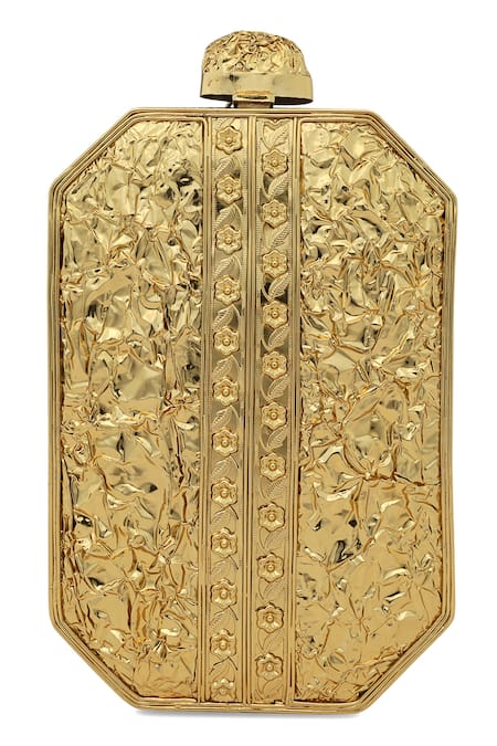 Intricate gold embroidery with pearl accents, Detachable shoulder strap for versatility, Unique box shape with a textured gold clasp