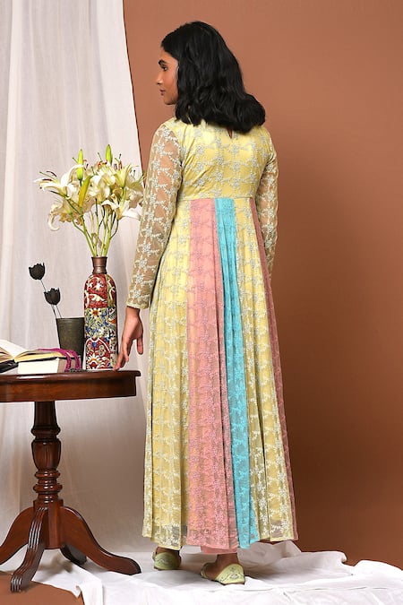 Multicolor anarkali with floral embellishment all over. Paired with pant.