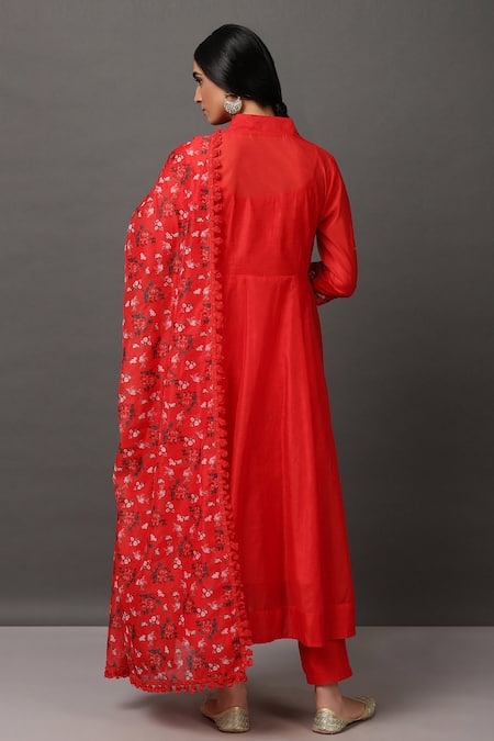 Red anarkali highlighted with embroidered cuffs, V-neckline & concealed placket. Comes with pant, cotton cami & printed dupatta.