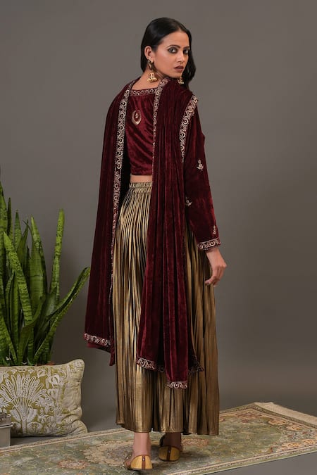 Maroon Velvet And Metallic Jersey V Neck Embroidered Lehenga Set