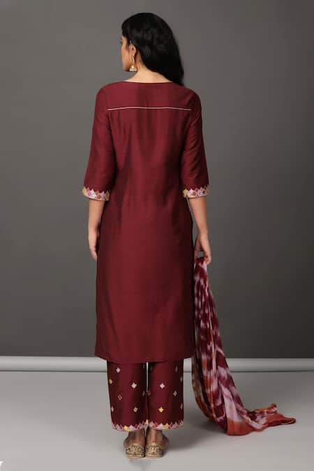 Wine kurta with inverted box pleat & placement motif inspired by the rich diversity of nature. Paired with straight pant with embroidered hem & tie dye dupatta with contrast border.