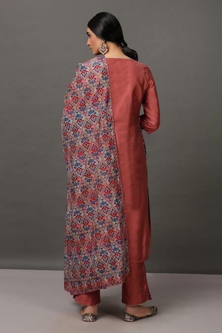 Melange pink kurta with round neckline, concealed embroidered placket, side pockets & straight silhouette. Comes with pant & printed dupatta.
