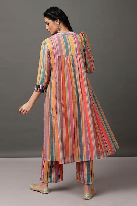 Multicolored kurta with all-over stripes, embroidered yoke, mandarin collar, concealed placket & straight silhouette. Comes with cotton cami & pant.