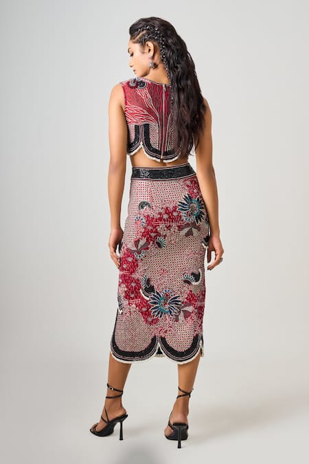 Burgundy top featuring kantha embroidered floral motifs with sequin-bead embellishments and 3D sequin flowers. Paired with an embellished slit skirt with scalloped edges.