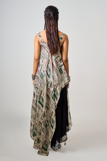Black and off white asymmetric singlet top featuring all over abstract prints with beaded and sequin embellished neckline. Paired with draped pant showcasing scallop hem and bead embroidery.