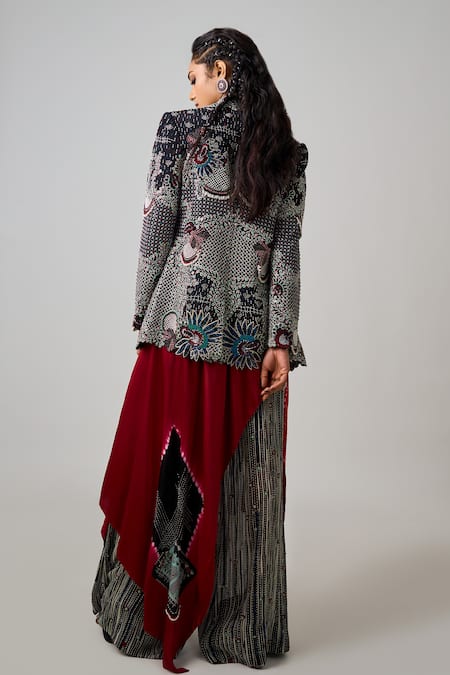 Buy_Nupur Kanoi_Black Crepe, Georgette, Satin Embroidery, Aztec Blossom Blazer Pant Set _Online_at_Aza_Fashions