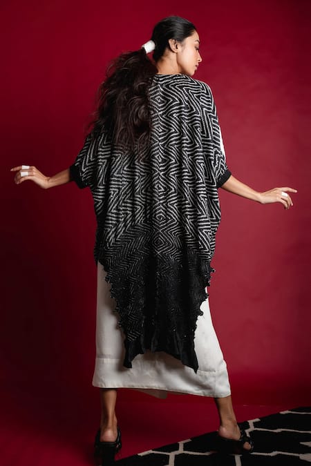Black shaded kurta with abstract bandhani print and asymmetrical hem. Comes with off white lungi.
