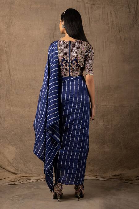 Blue pre-draped saree with bandhani print and embroidery on the waistband. Comes with embroidered blouse.