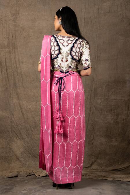 Old rose pre-draped saree with bandhani print and cowl drape. Comes with white blouse and belt.