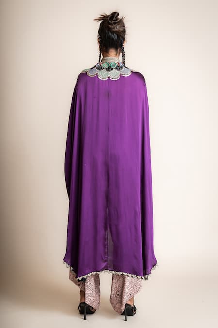 Buy_Nupur Kanoi_Purple Crepe Embroidery Cut Out Border Embellished Cape With Printed Pant_at_Aza_Fashions