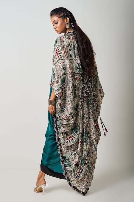 Teal blue gathered sack dress featuring a beaded embroidered neckline. Paired with an off-white kite jacket showcasing all-over abstract prints and scallop embroidered borders.