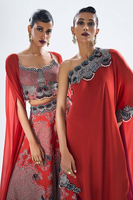 Rust orange one shoulder asymmetric layered cape featuring kantha embroidered floral motifs with sequin and bead embellishments. Paired with an embellished gharara that complements the cape's design.