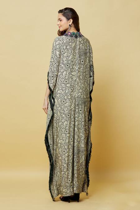 Embroidered neckline with mirror and scallop details, Tassel border along the edges, Floral print throughout the fabric