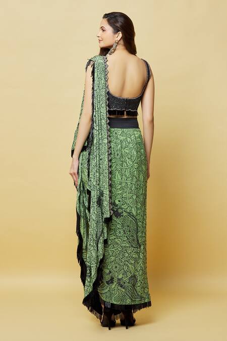 Green Crepe Sequins, Beads Asymmetric Floral Print Pre-draped Saree With Blouse