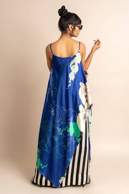 Cobalt blue asymmetric panelled top featuring floral prints. Paired with a striped lungi style skirt.