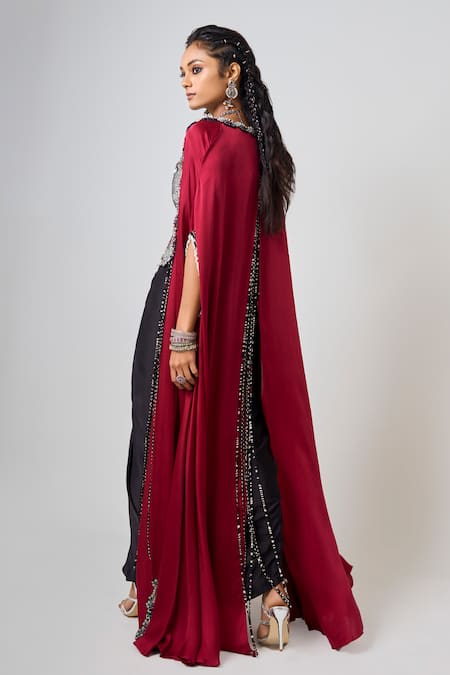 Burgundy cape featuring floral scallop motifs on the border. Paired with a top showcasing kantha embroidered checkered motifs and a sequin-bead embellished bodice, along with a draped ruched skirt.