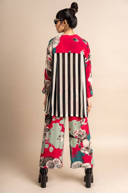 Magenta shirt featuring floral prints with a striped back and pleated details. Paired with a matching printed pyjama for a complete look.