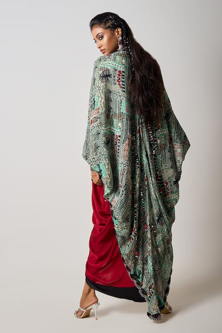 Burgundy gathered sack dress featuring a beaded embroidered neckline and tassels. Paired with a mint green kite jacket adorned with abstract prints and an embroidered border.