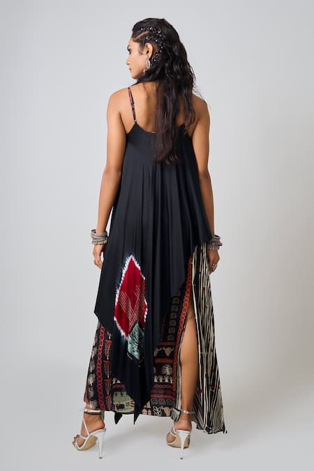 Kantha stitch embroidery on the bodice, Abstract printed hem, Tie-dye pattern detailing