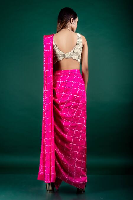 Hot pink pre-draped cowl saree with bandhani work chequered detailing. Comes with a french-knot zardozi embroidered blouse with applique motifs.