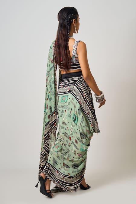 Mint green pre-draped cowl saree featuring all-over abstract prints and a beaded, sequin border. Paired with a stripe embroidered blouse adorned with sequins and beads.