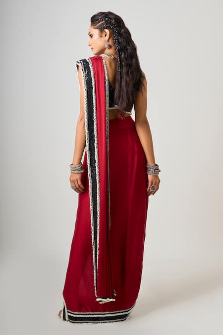 Burgundy Crepe, Satin Sequins, Pre-draped Slit Saree With Embroidered Blouse