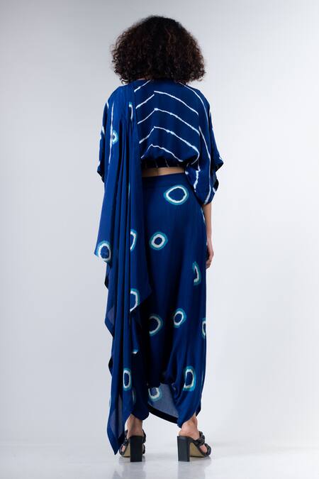 Blue dhoti saree with all-over polka dot print. Paired with leheriya print kaftan blouse.