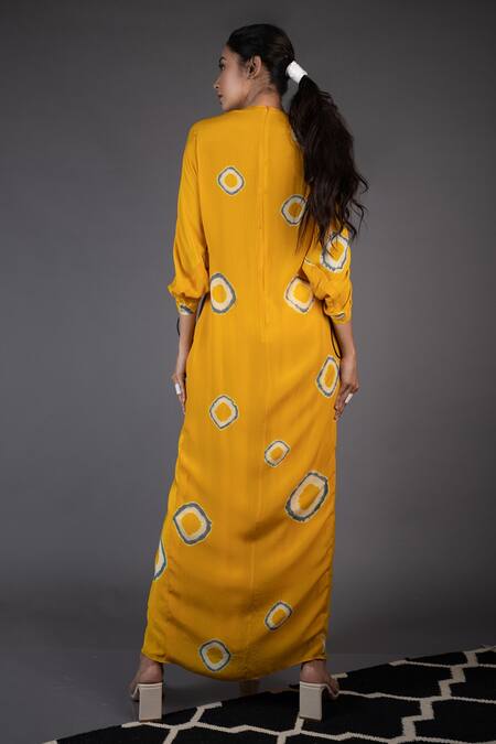 Buy_Nupur Kanoi_Yellow Crepe Geometric V Neck Printed Draped Dress_at_Aza_Fashions