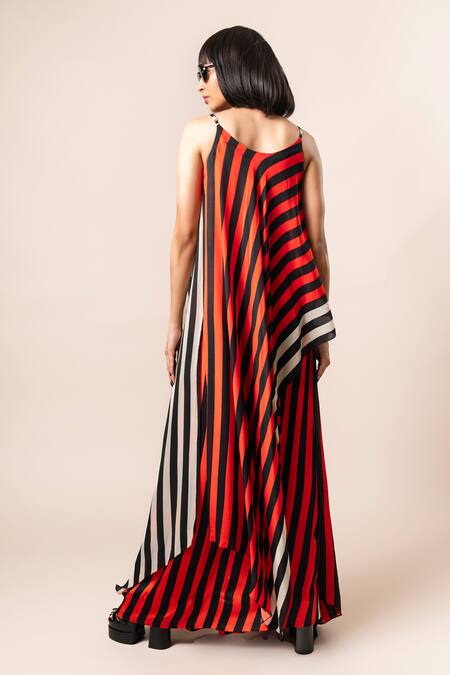 Tangerine V neck crop top featuring asymmetric overlap draped panels and contrast black & white stripe print. Paired with a satin printed pleated lungi skirt with color block panels and attached lining.