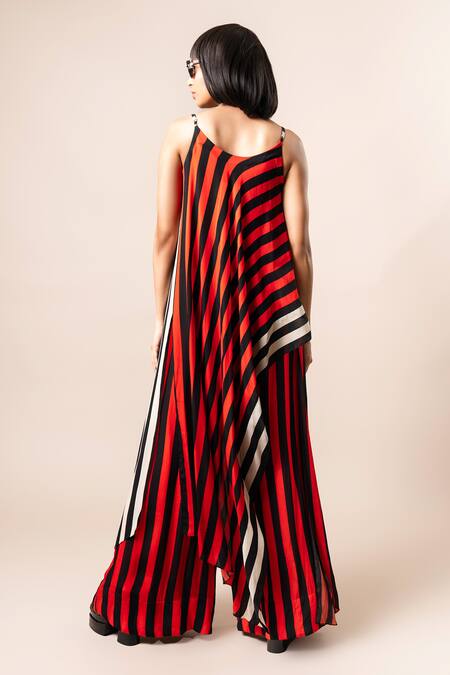 Tangerine crepe crop top featuring asymmetric overlap draped panels and all over contrast black & white stripe print. Paired with a printed A-line wide legged pant.