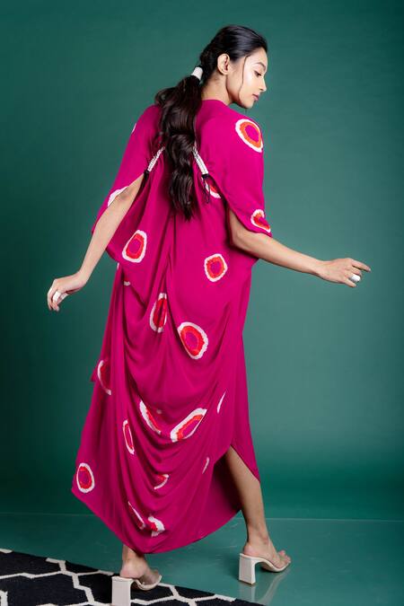Rani pink jacket with multicolor polka dot prints, cowl detail at the back and white ruched detail. Comes with pink sack dress.