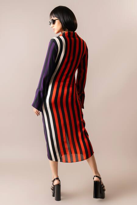 Multi color crepe long shirt featuring an all-over tangerine, aubergine, black, and white stripe print